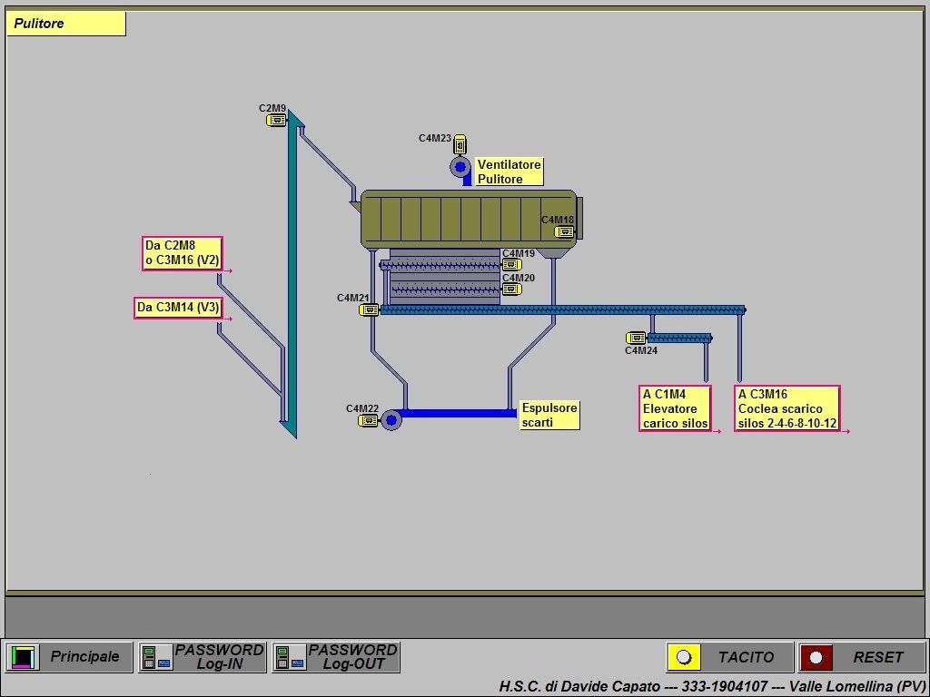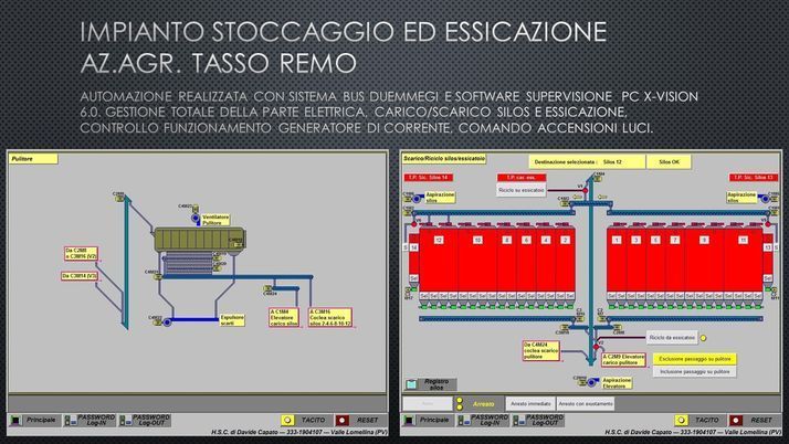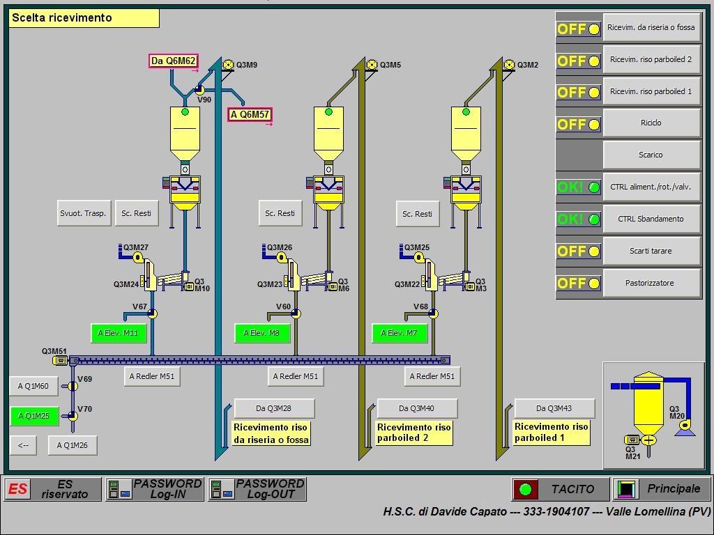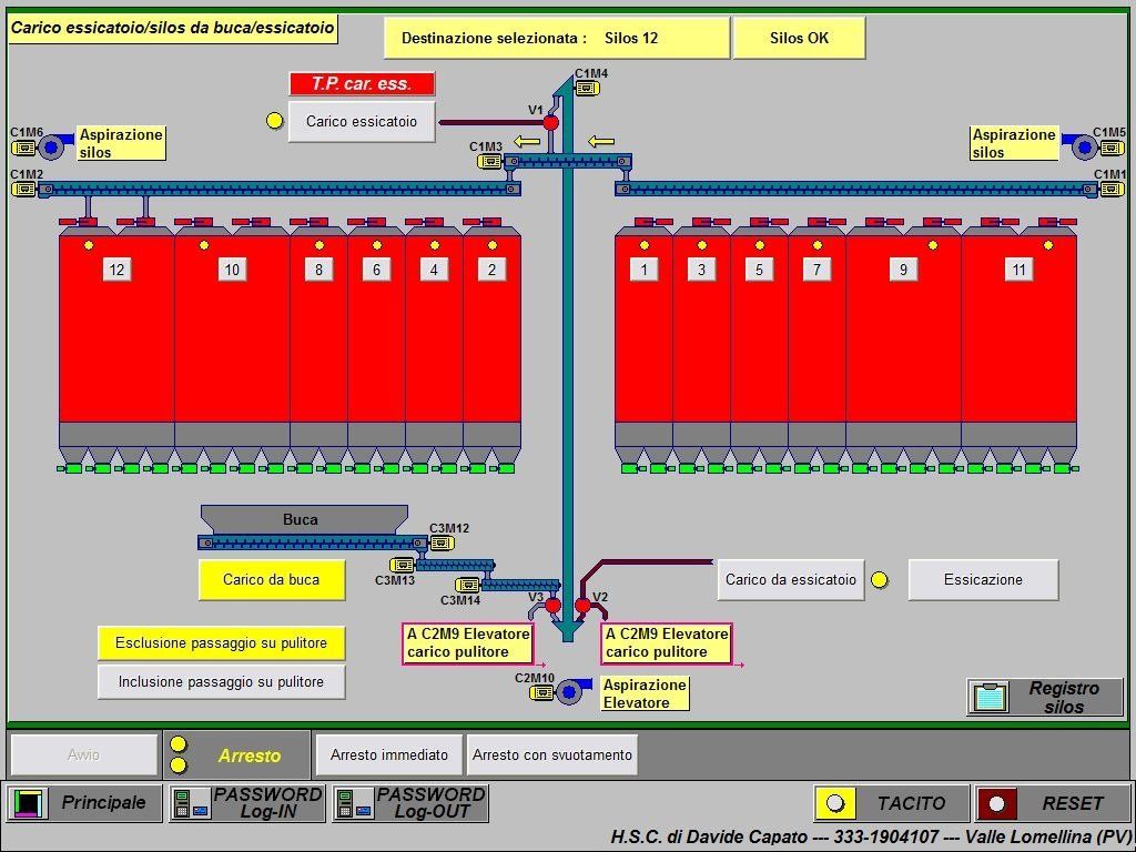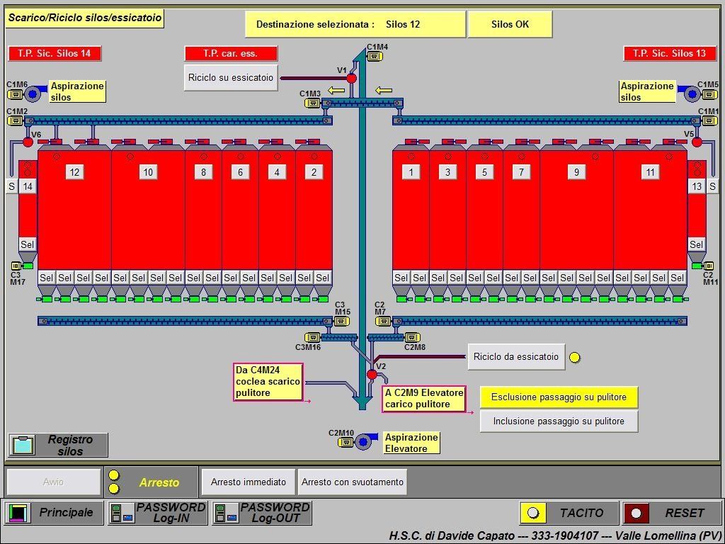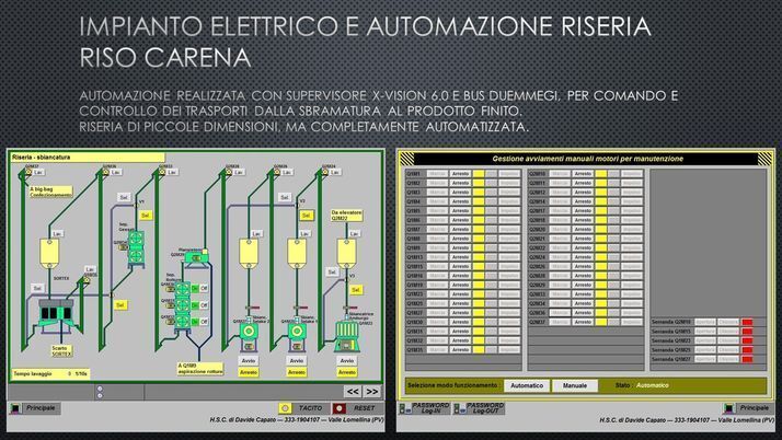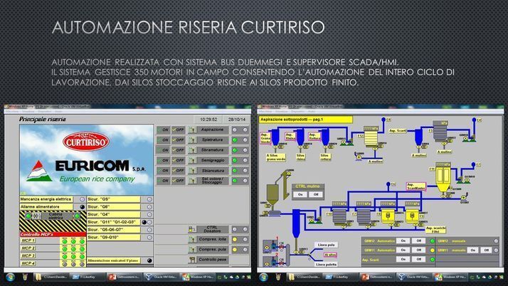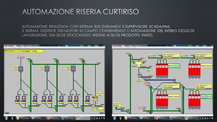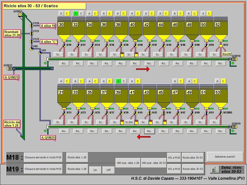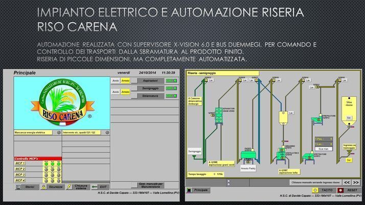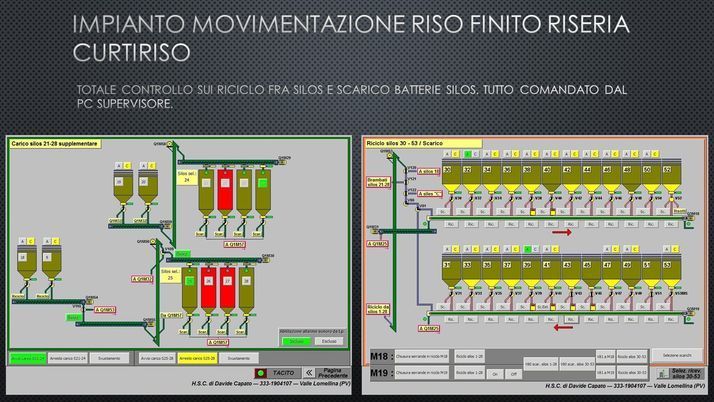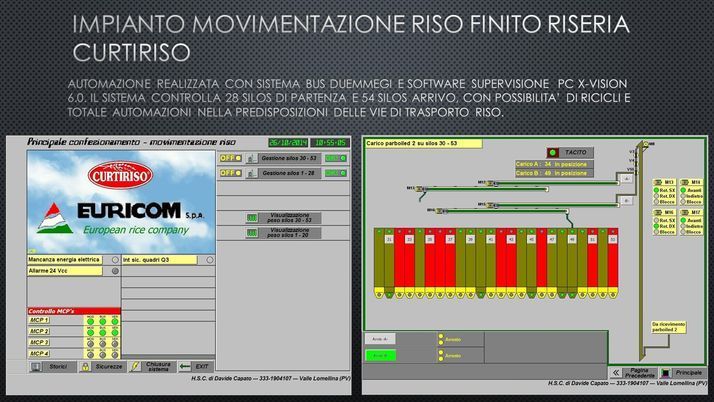 Questo impianto, realizzato con sistema bus Duemmegi e software supervisione PC X-Vision 6.0, permette di controllare 28 silos di partenza e 54 silos arrivo, con possibilità di ricicli. Il sistema garantisce l’automazione totale del processo di predisposizione delle vie di trasporto del riso.